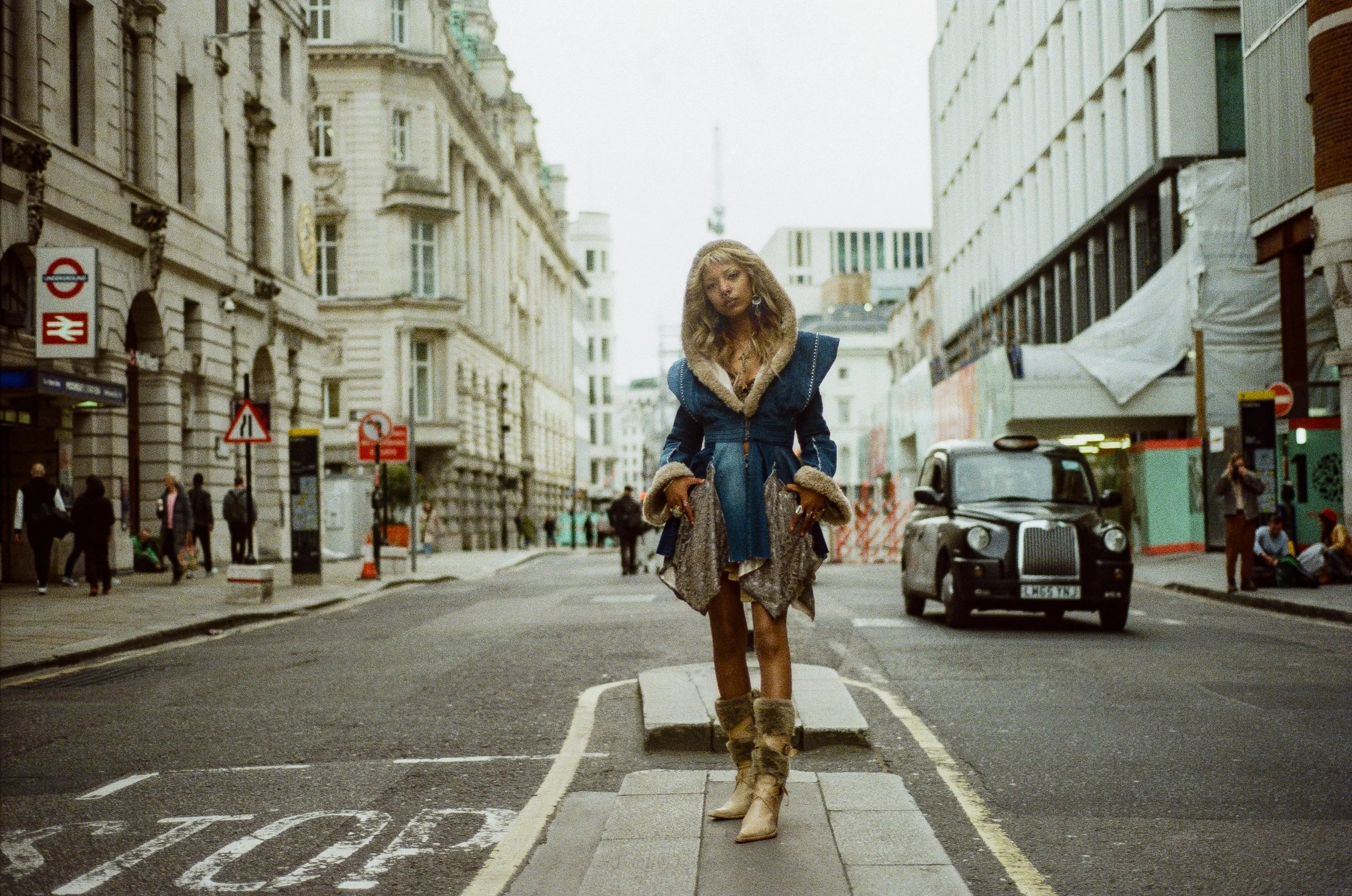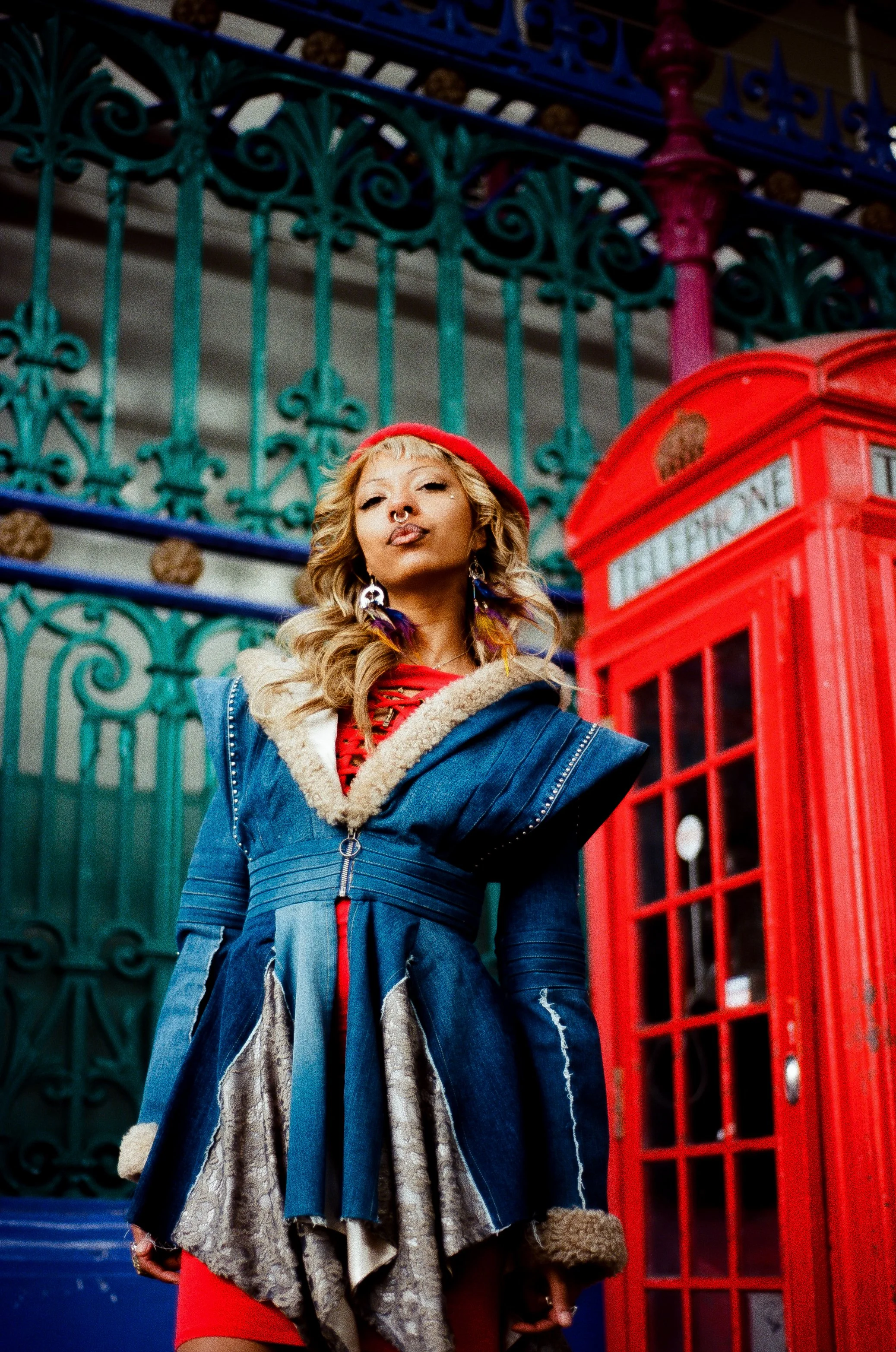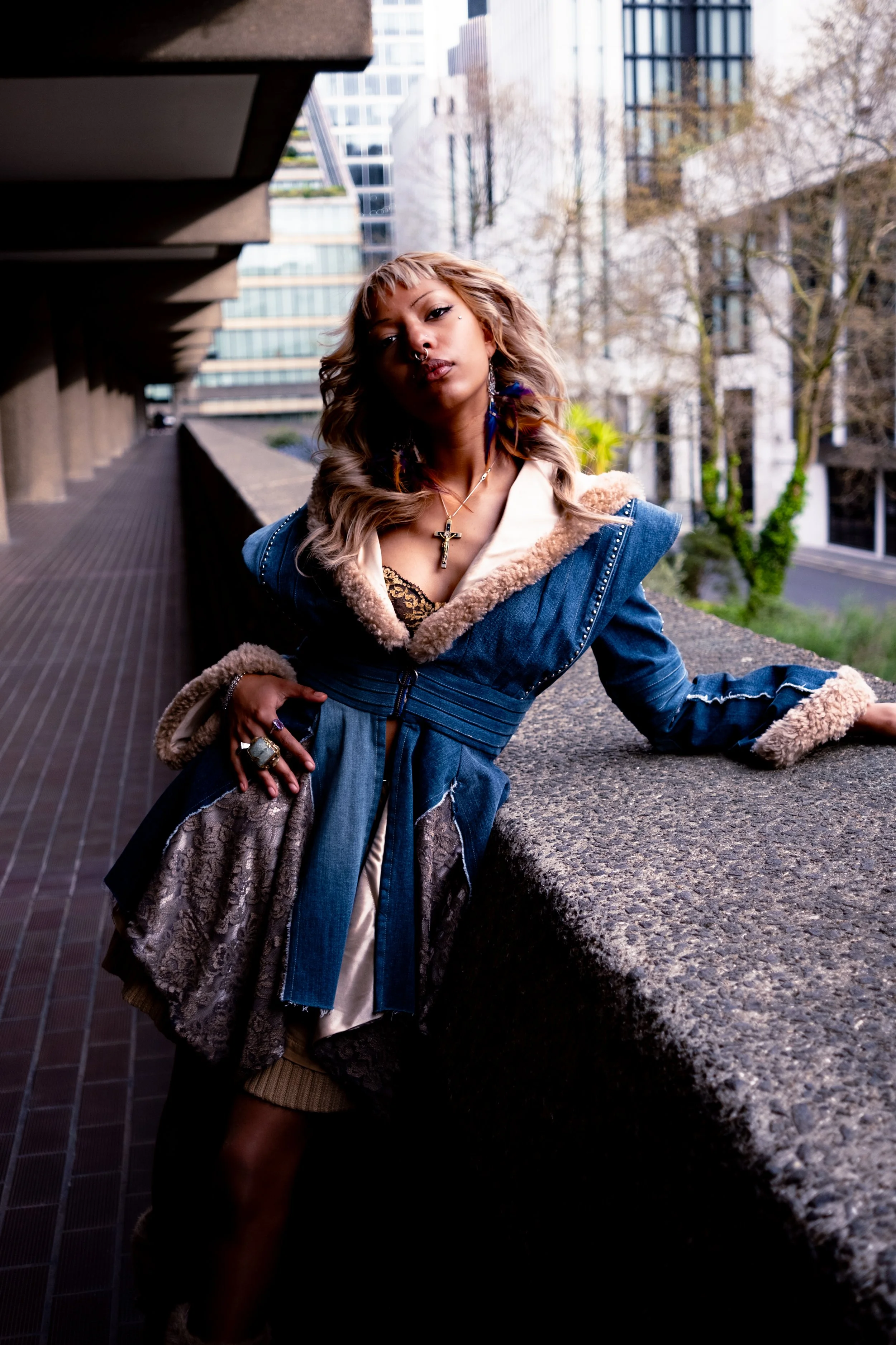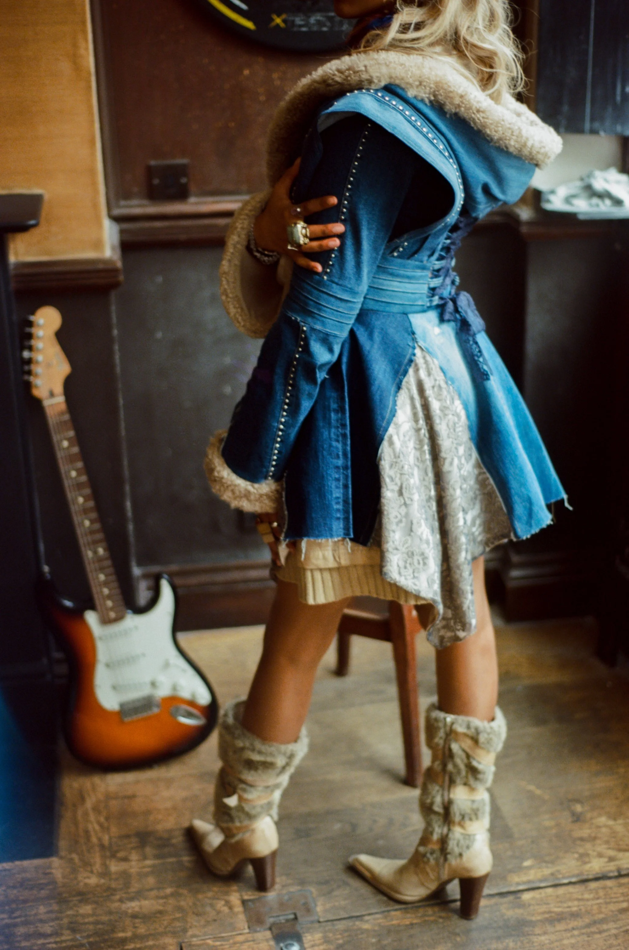 This Jacket is made of Up-Cycled Marks & Spencer’s denim jeans. Part 1970s rock and roll, and part fantasy, this jacket was inspired by a visit to Portobello Road Vintage Market completed while on an exchange year at Kingston University in London, UK.